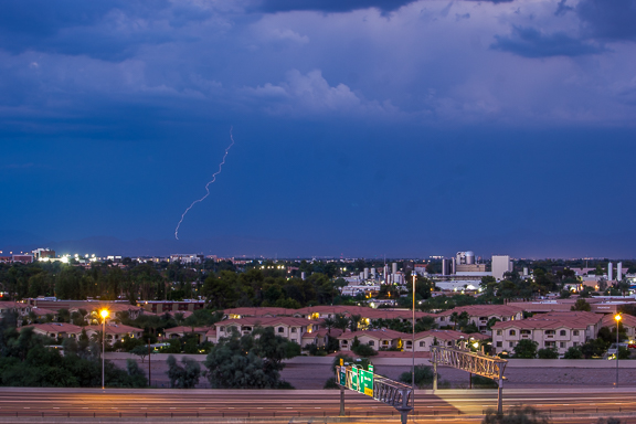 I am always excited when there is a full moon. I drove to several places this afternoon to scout out my "ideal spot" for tonight's event. I have found a new favorite. Pending thunderstorms threatened to block the full moon, but I was happy to be out shooting. Keeping a positive attitude (not always easy when it is 108 in the desert), I set up the tripod and tested the settings. I was disappointed by the cloud cover in the direction of the moon, but was able to get a few photographs before it was hidden. The sunset, however, did not disappoint. Here are the photos, in the order that I took them. Running back and forth from sunset to moonrise!! Thunderstorms on the way in and I was able to catch a lightning strike in the east. Facing the northwest. The tower is at the Phoenix airport. North east, big zoom, playing with the zoom lens to see what I could get. The virga (the dark thin lines coming down from the cloud...rain!) near down...